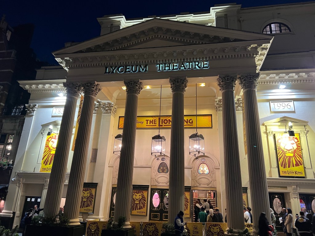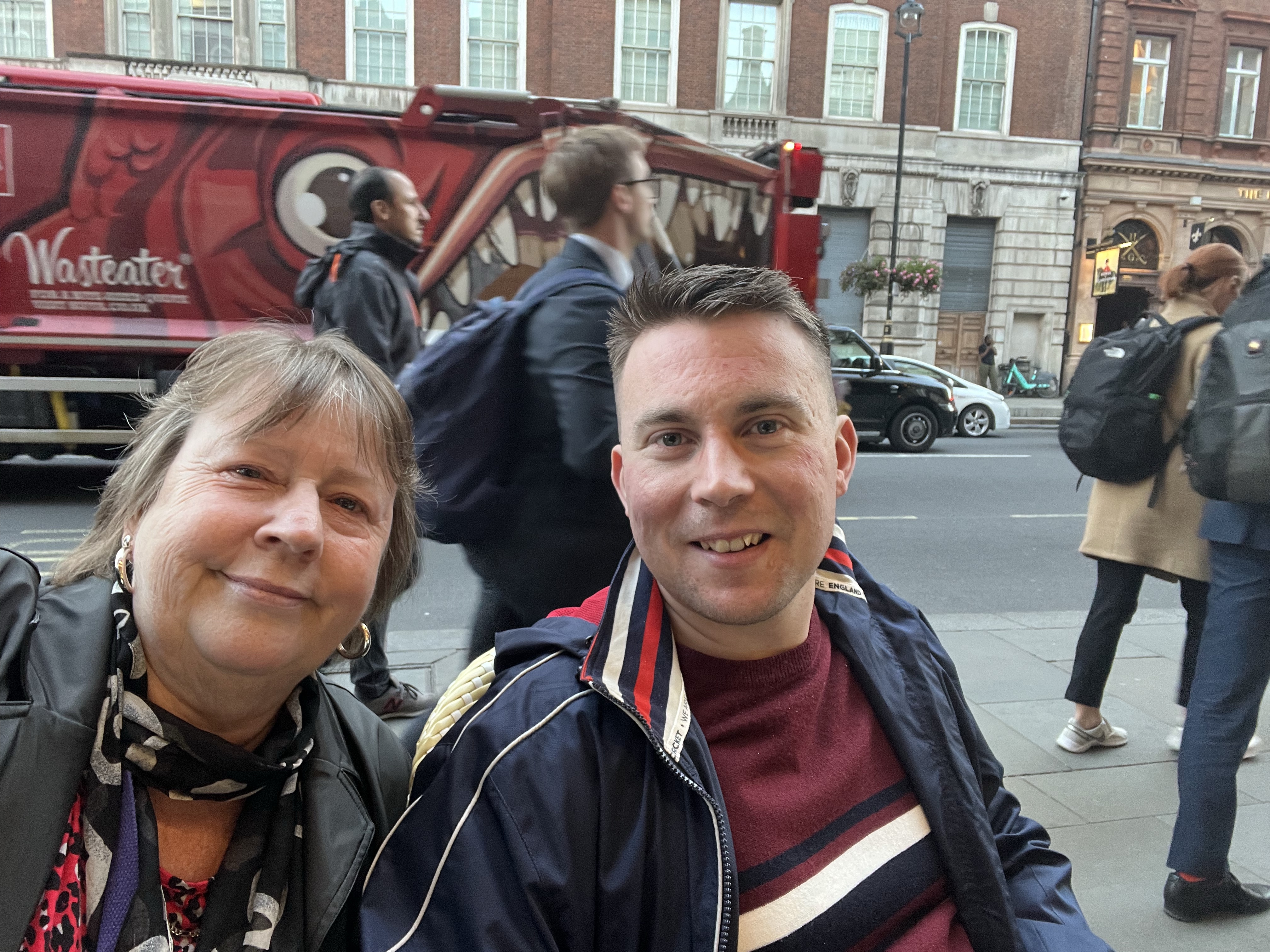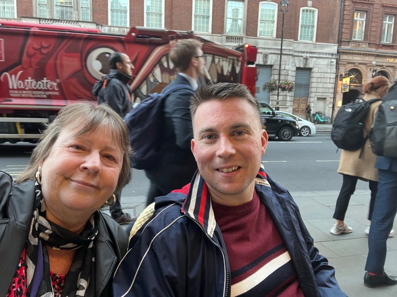 We arrived at the Trafalgar Theatre. It was going well for me. I might have been on the trip as the guide but I am well known for getting myself lost (missing my turn off the M11 to Harlow and ending up in Walthamstow being my most famous misadventure) so to have got everyone safely to the hotel and then to the theatre was a big success. We had coffee and cake sitting outside an impossibly posh-looking cafe opposite – people walked past in bow ties as I sat there in my joggers and wearing an England Cricket jacket.