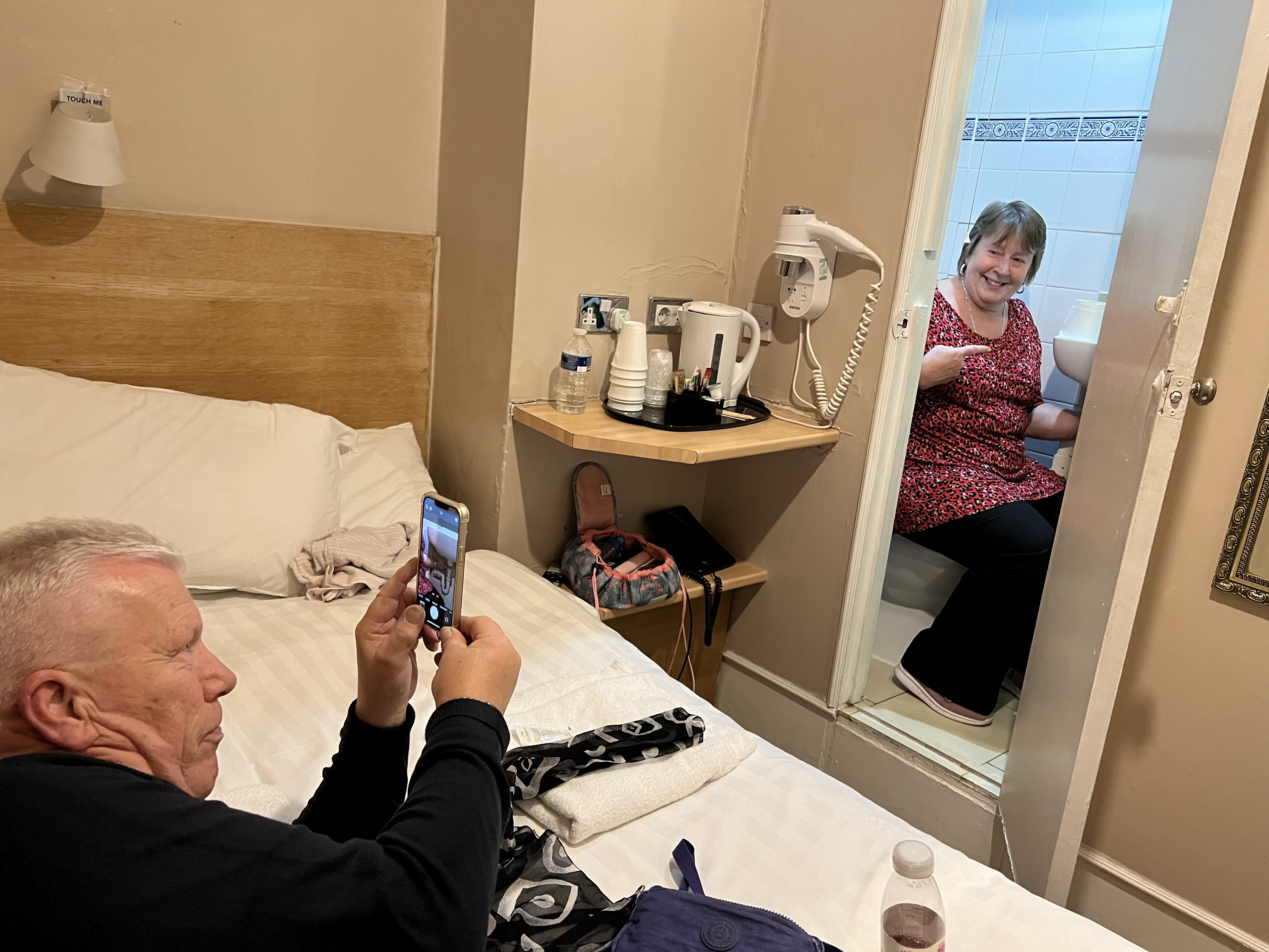 It’s quite obvious that the wardrobes in these rooms had been converted into toilets and showers, allowing the owners to market the hotel as having en suite rooms. I have never seen a toilet so small. My mum could have brushed her teeth whilst sitting on the throne, and we blokes had to stand at an angle to have a wee. That uncontrollable laughter from earlier in the day returned with a vengeance at my first sight of the loo-in-a-cupboard. It was quite a step down back into the room from the toilet, but I had nothing to worry about because if I tripped I would have landed safely on the bed.