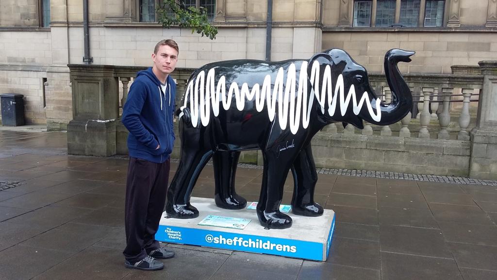 With the Arctic Monkeys elephant sculpture, Sheffield city centre, July 2016