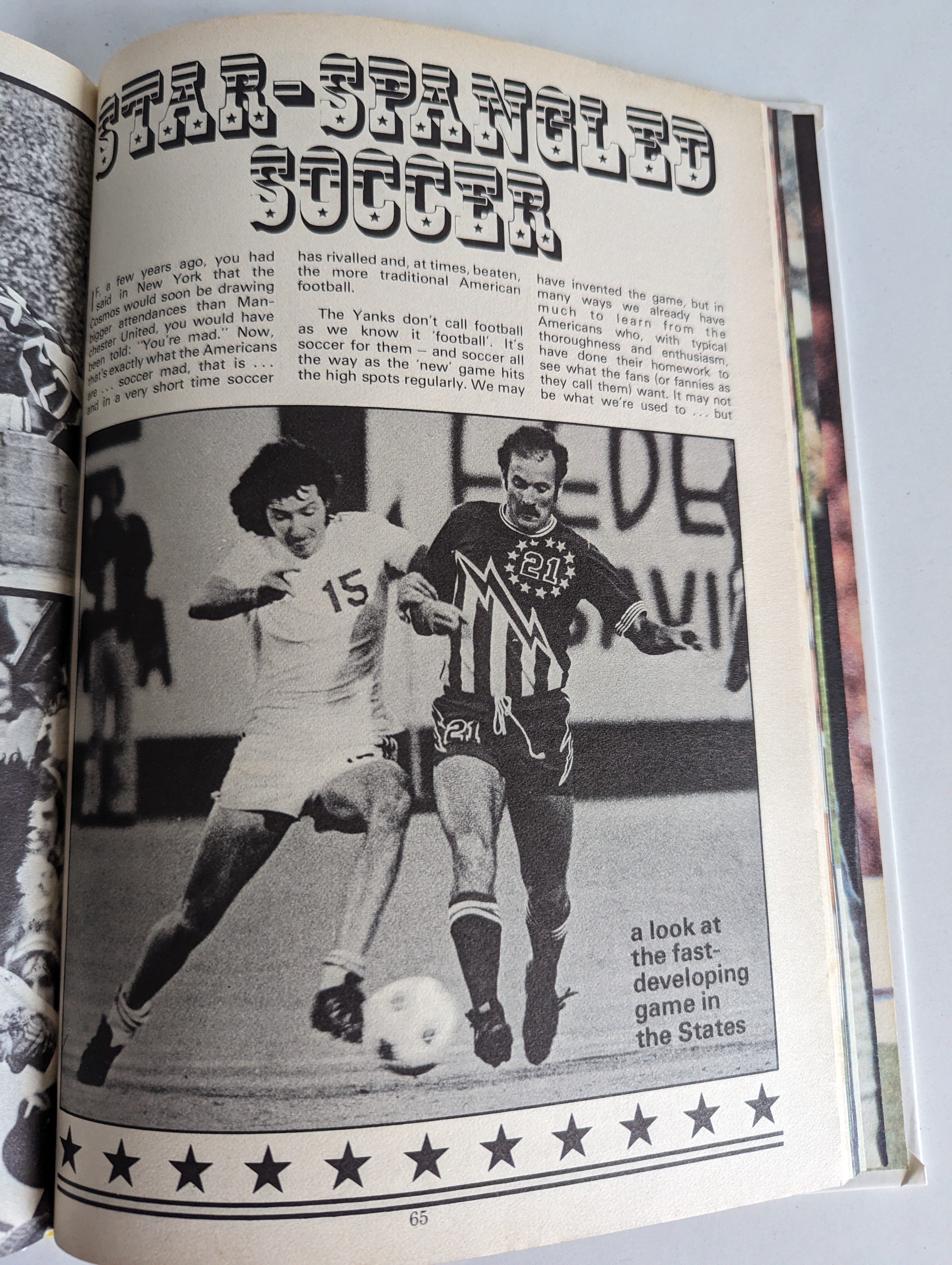 The final thing I’ve picked out from the Score annual of 1979 is this feature on the rising popularity of football in the USA. Aside from claiming that the Americans refer to fans as “fannies” (really?), it explains the slightly different rules used in the North American Soccer League. A line was drawn on the pitch, 35 yards from goal, and a player could only be offside if he was goal side of it. That’s not a bad idea actually…