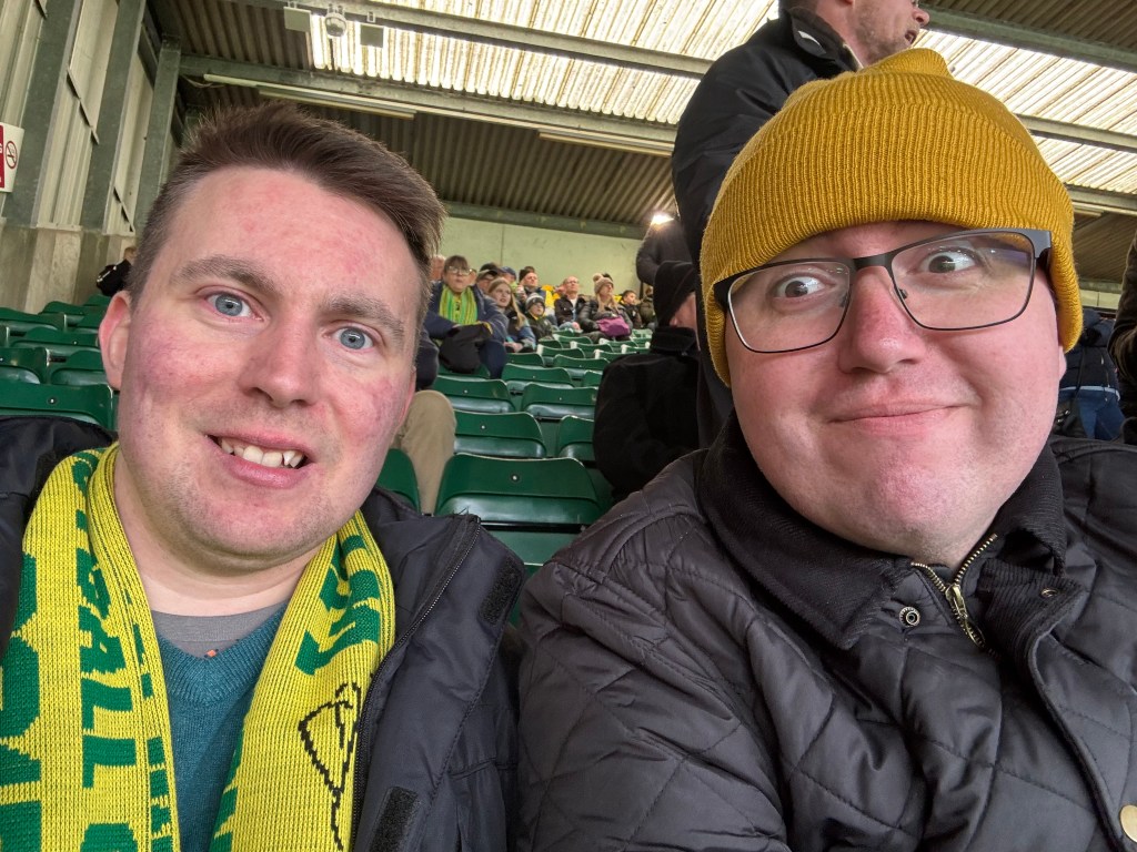 Fast forward a week, and I went to Norwich’s game against Bristol City with my friend Gavin – the one who made me walk 7 miles. I’m actually giving up my season ticket at Carrow Road after this season, and with this the penultimate home league game we sat in the River End, opposite my usual position in the Barclay, for the 1-1 draw. Norwich didn’t really turn up against a side that had nothing to play for and missed the chance to move up to 5th. Never mind. It’s Swansea at Carrow Road this weekend. Here’s me and Gavin looking like a couple of hunks:
