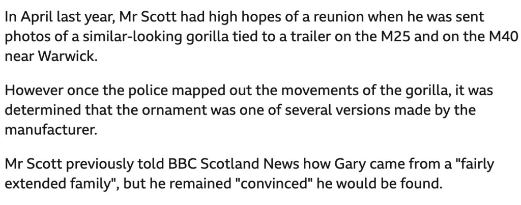 This truly bizarre crime feels uniquely British. As we know from Netflix, the US is full of incredible true crime stories that usually involve murder. Here, we get an 8ft Gorilla ornament nicked from the entrance to a garden centre.