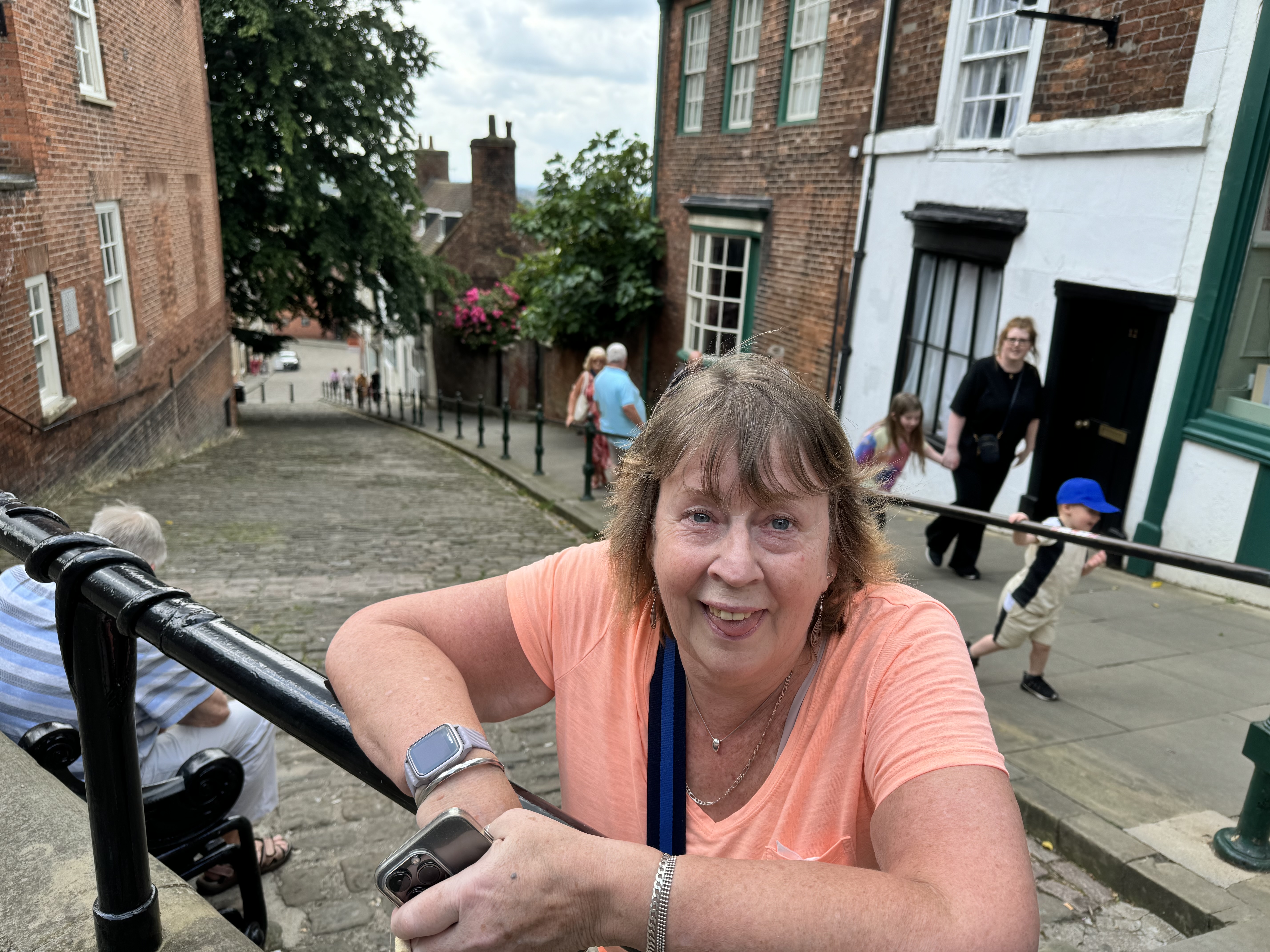 We had been warned about Steep Hill in Lincoln, possibly the most aptly named road in Britain. My dear mum, who is asthmatic, has a hernia and has just turned 60, surprised the both of us by managing to walk up this monster of a hill. Here she is at the top.