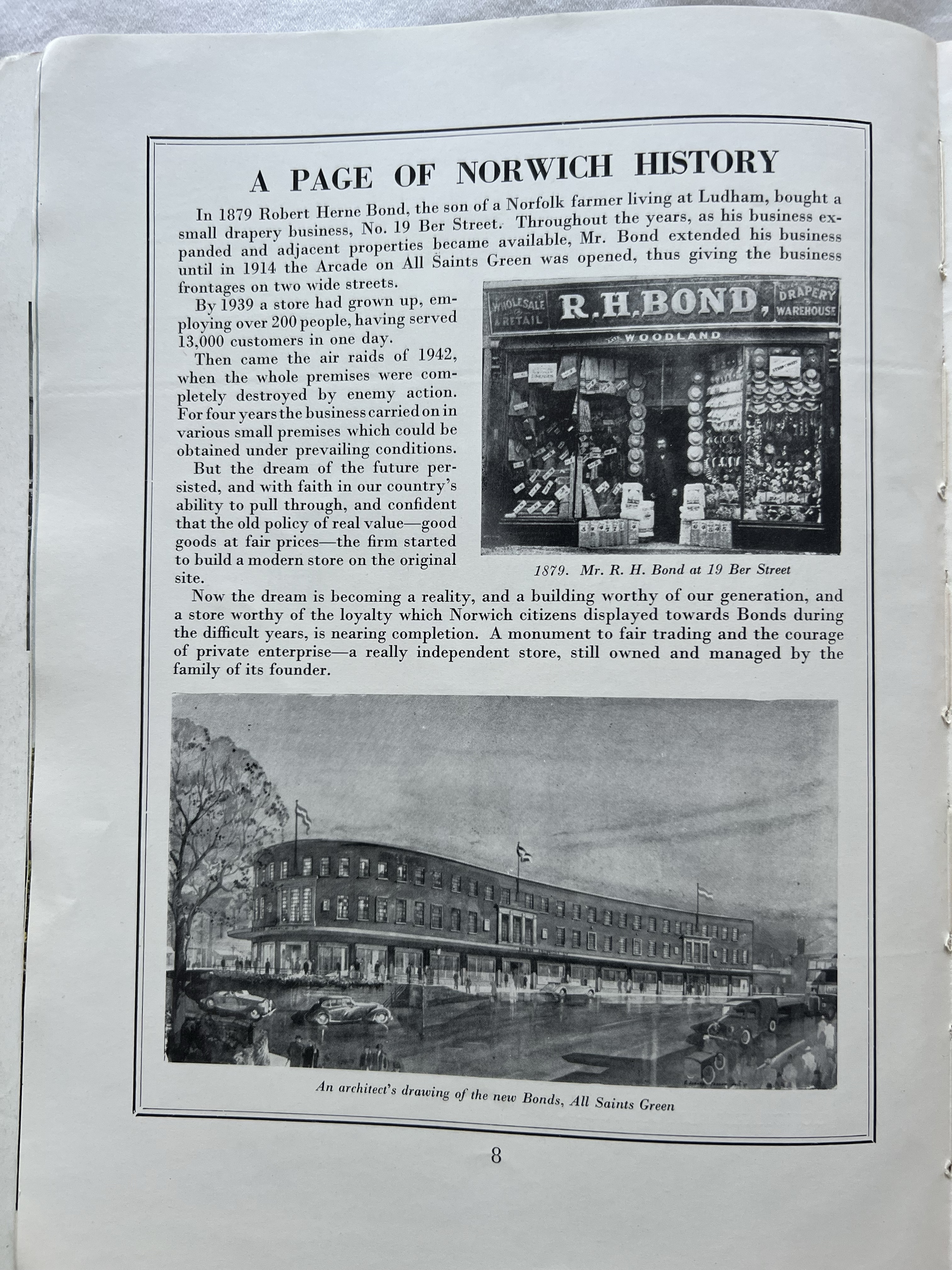 The book is full of articles about the city and adverts from local businesses. The two are worth a post each, so I’m going to focus on the adverts today. They provide a window into a Norwich of yesterday – a city that made things (mainly shoes) and a city dominated by local names rather than high street chains. But they also show names that are immediately familiar.
