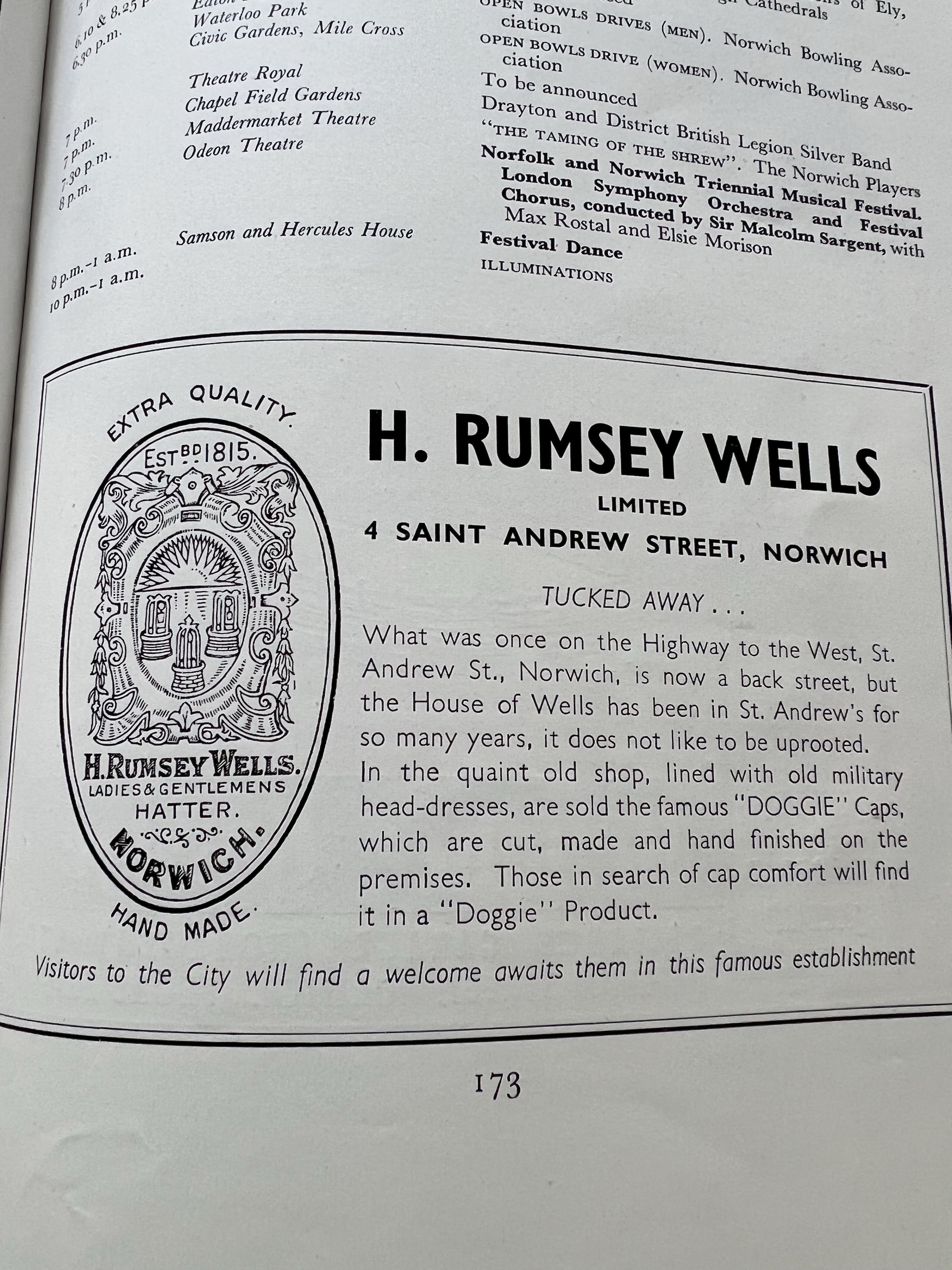 And finally, here’s an advert from hat maker H. Rumsey Wells. The shop closed in 1974 but, if the name sounds familiar, it’s because the name of the shop lives on in the name of a pub that now stands on its site.
